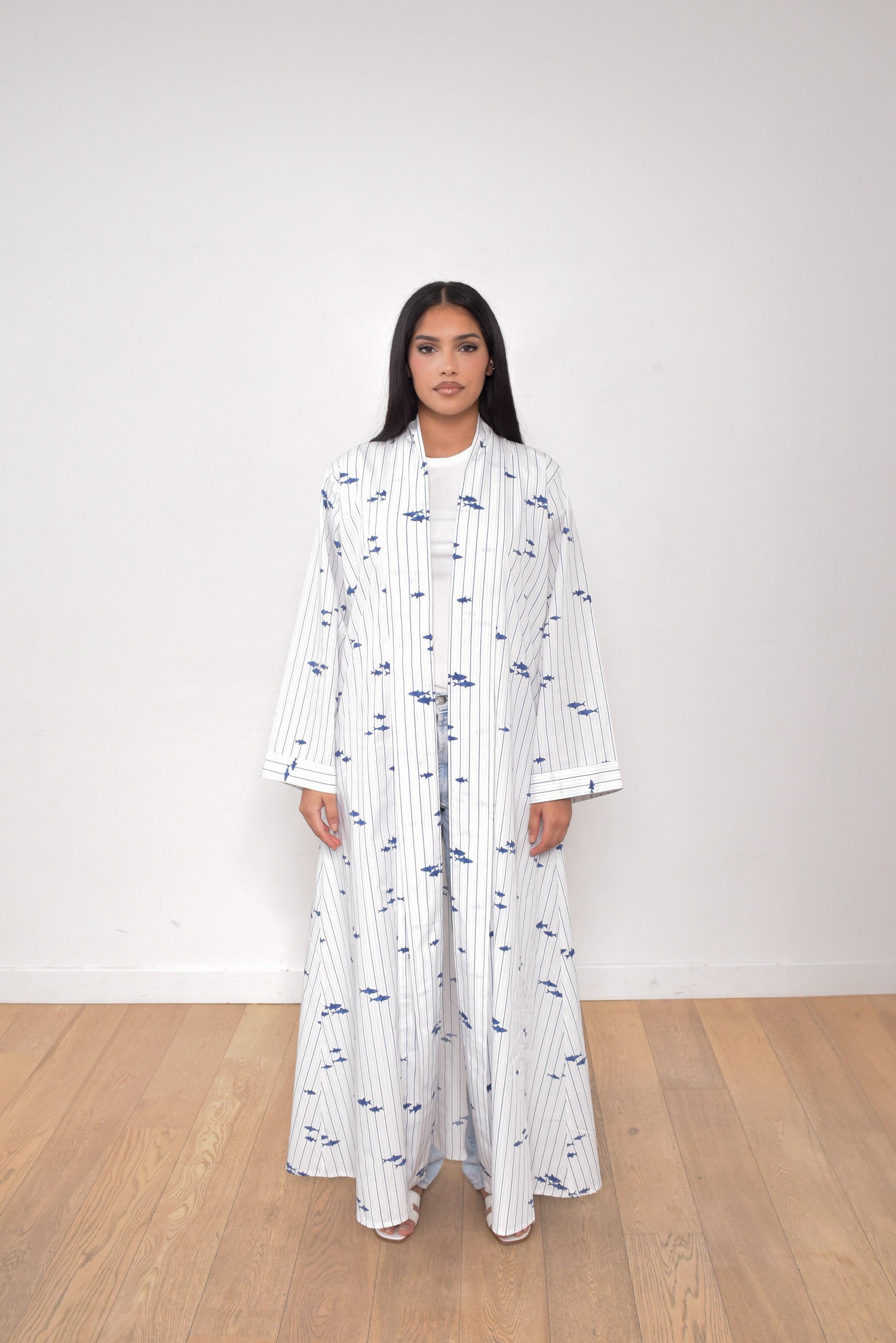 Découvrez l’alliance unique entre l’Abaya et le Kimono avec ce Kibaya long et fluide. Laissez-vous séduire par cette kibaya fluide au design unique, mêlant sobriété et raffinement. Son tissu blanc rehaussé de fines rayures bleues marines et de délicats motifs poissons apporte une touche de fraîcheur et d’originalité, parfaite pour celles qui recherchent une tenue chic et confortable. Portez-le ouvert sur une tenue casual pour un look décontracté, ou ceinturez-le pour souligner votre silhouette lors d’une occasion spéciale.